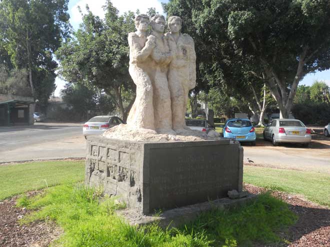 פסל ה"שלושה" פסלת: בתיה לישנסקי, מוצב בכניסה של קיבוץ עינת.