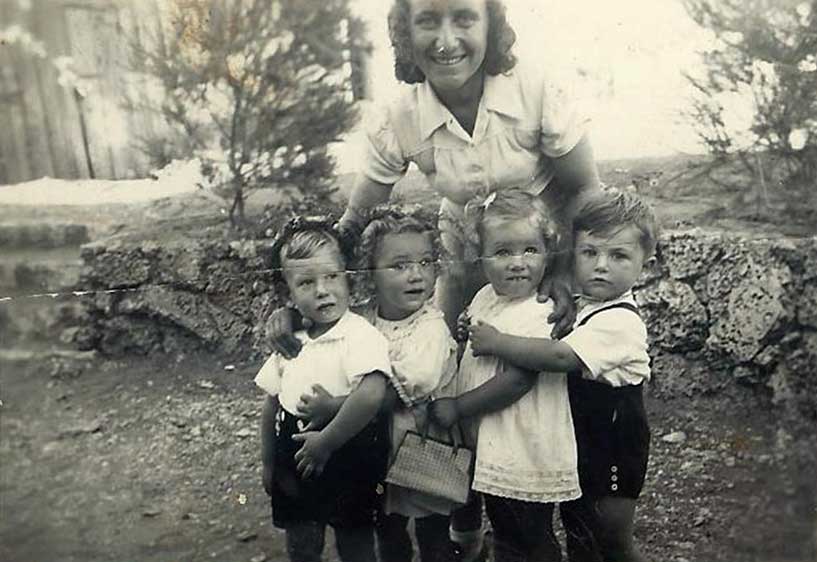 שלומית שניה מימין בגן הילדים בגבעת השלושה עם חבריה עמוס, מאירה, יעקב והמטפלת חיקה ליפשיץ